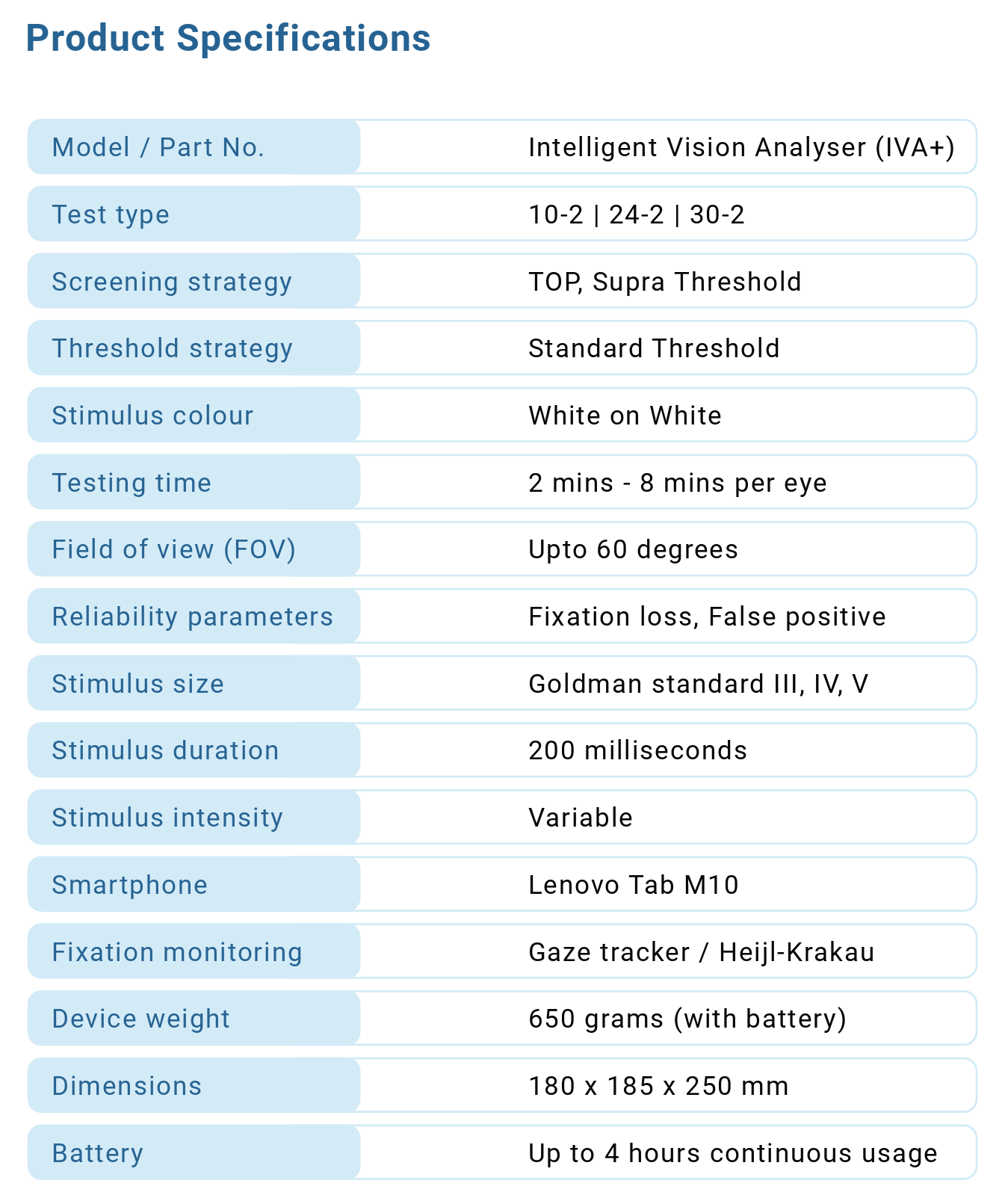 iVA+ reports are designed as per globally accepted format. Tests are designed as per Goldmann perimeter standards.